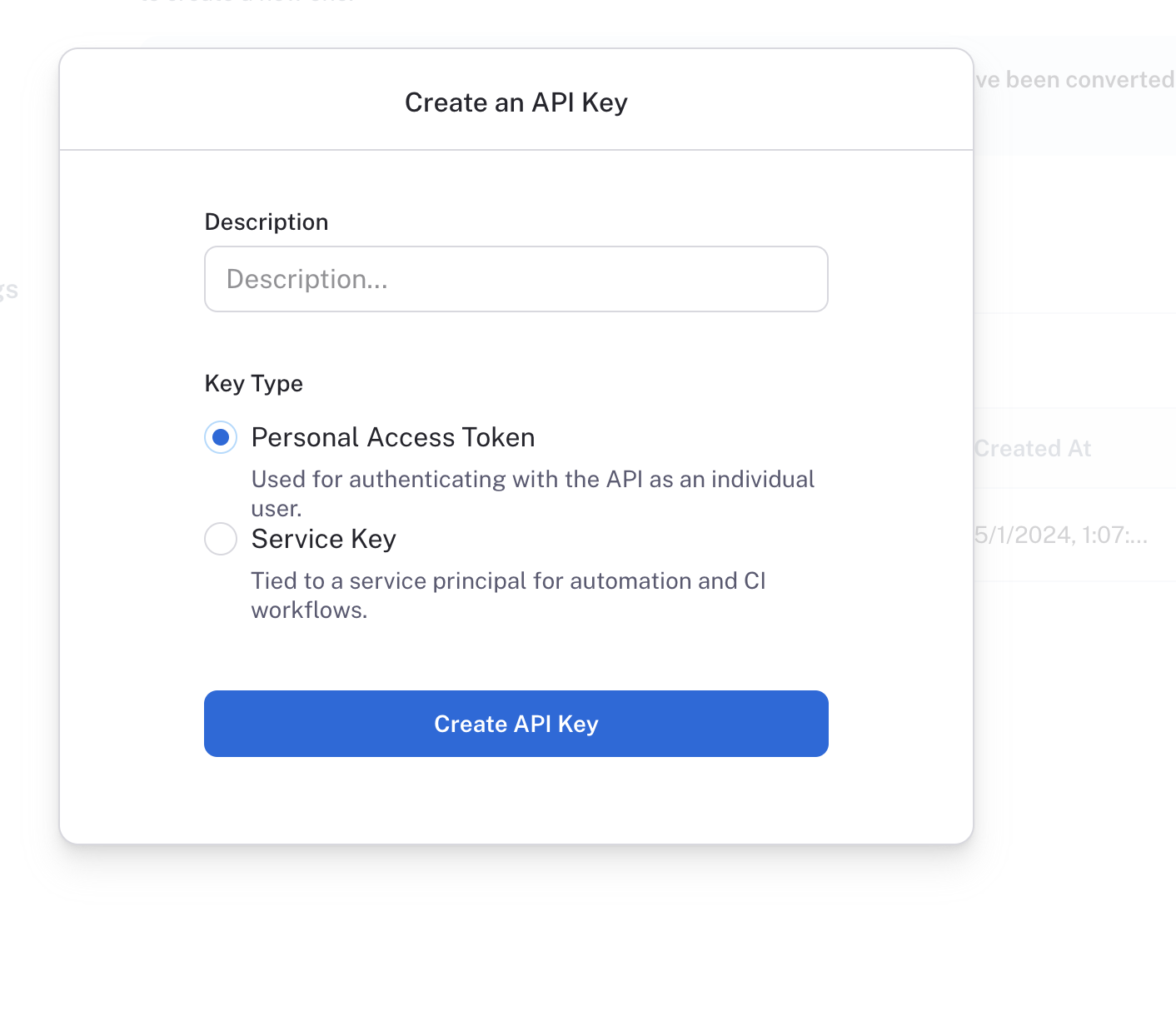 Read more about the differences between Service Keys and Personal Access Tokens under admin concepts